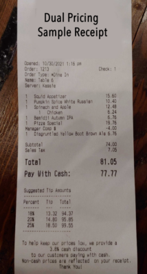 For example, if a meal is priced at $20, customers paying with a credit card would pay the full amount. However, if they choose to pay with cash, they might receive a discount (e.g., 5%), bringing their total to $19.